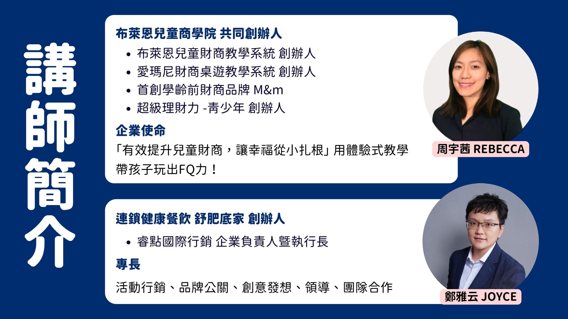 布萊恩兒童商學院 共同創辦人 布萊恩兒童財商教學系統 共同創辦人 愛瑪尼財商教學系統 共同創辦人 首創學齡前M&m財商品牌 超級理財力-青少年系統 共同創辦人