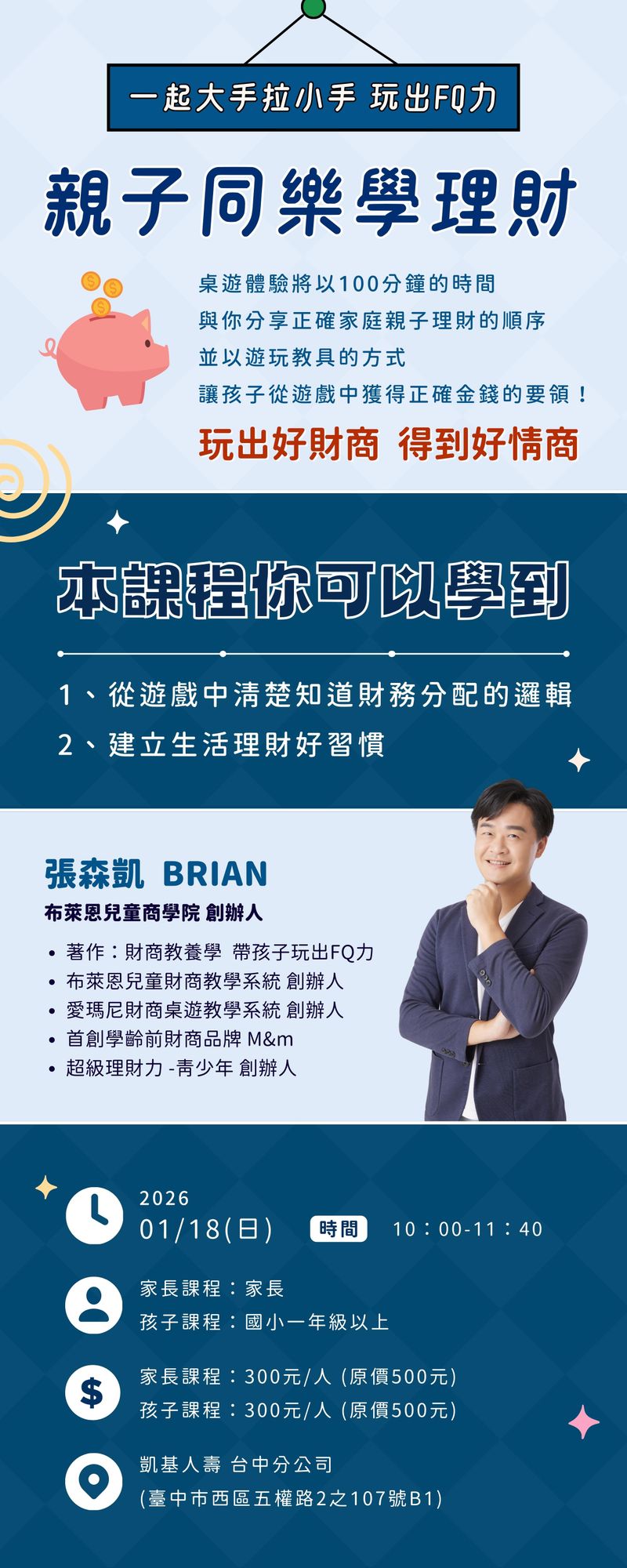 【小提醒:每個家庭最多報名 兩大三小】桌遊體驗將以100分鐘的時間,與你分享正確家庭親子理財的順序,並以遊玩教具的方式,讓孩子從遊戲中獲得正確金錢的要領!