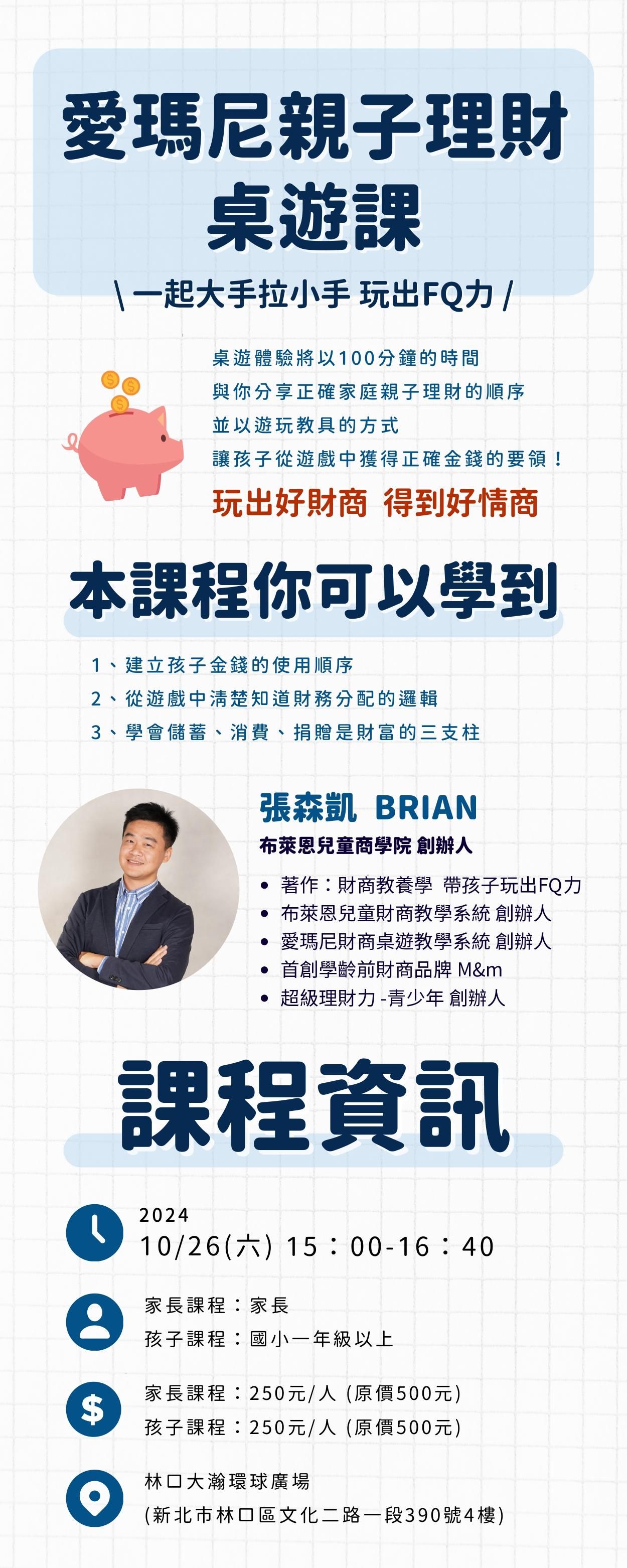 【小提醒:每個家庭最多報名 兩大三小】桌遊體驗將以100分鐘的時間,與你分享正確家庭親子理財的順序,並以遊玩教具的方式,讓孩子從遊戲中獲得正確金錢的要領!