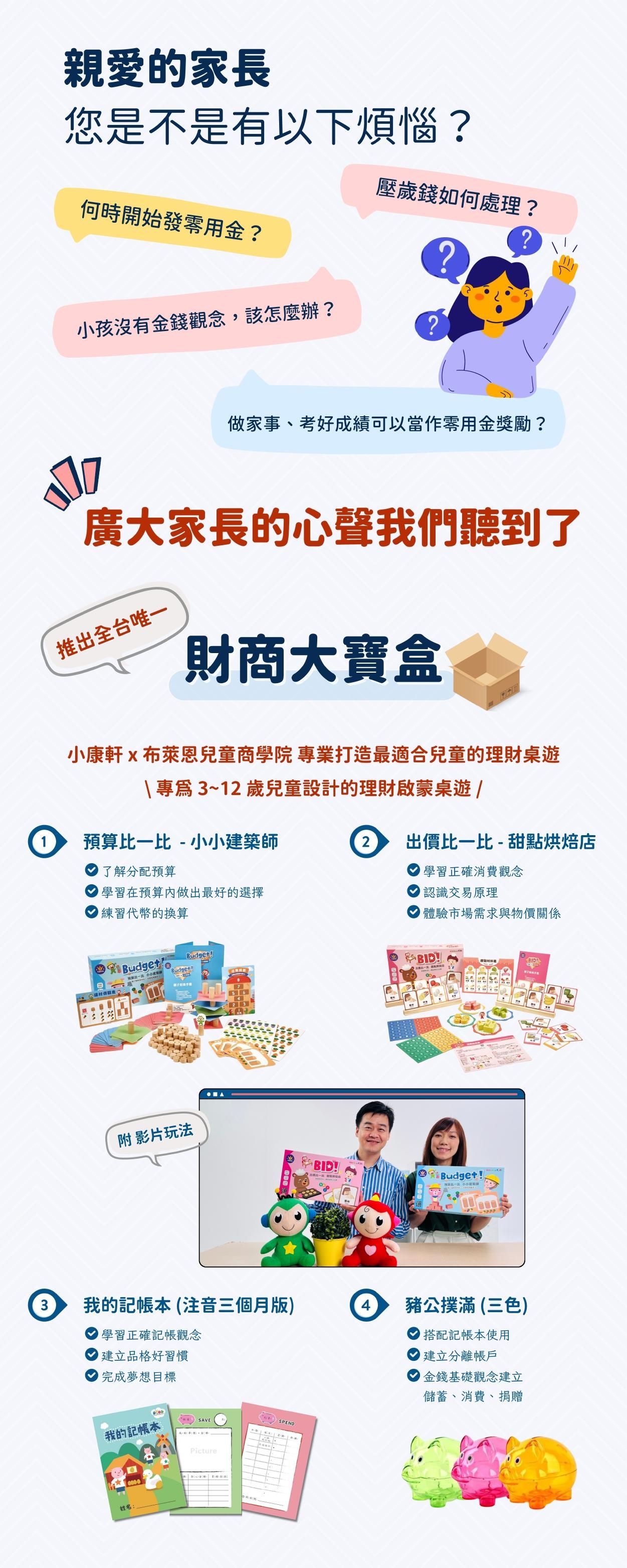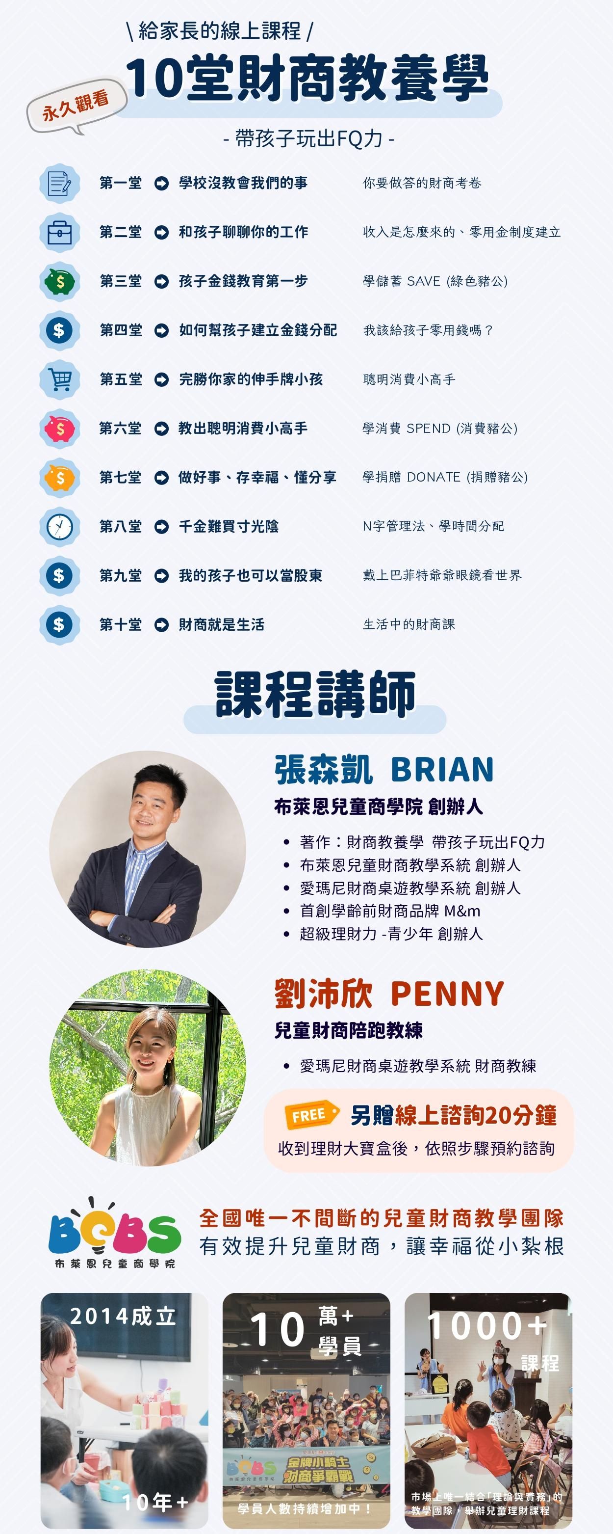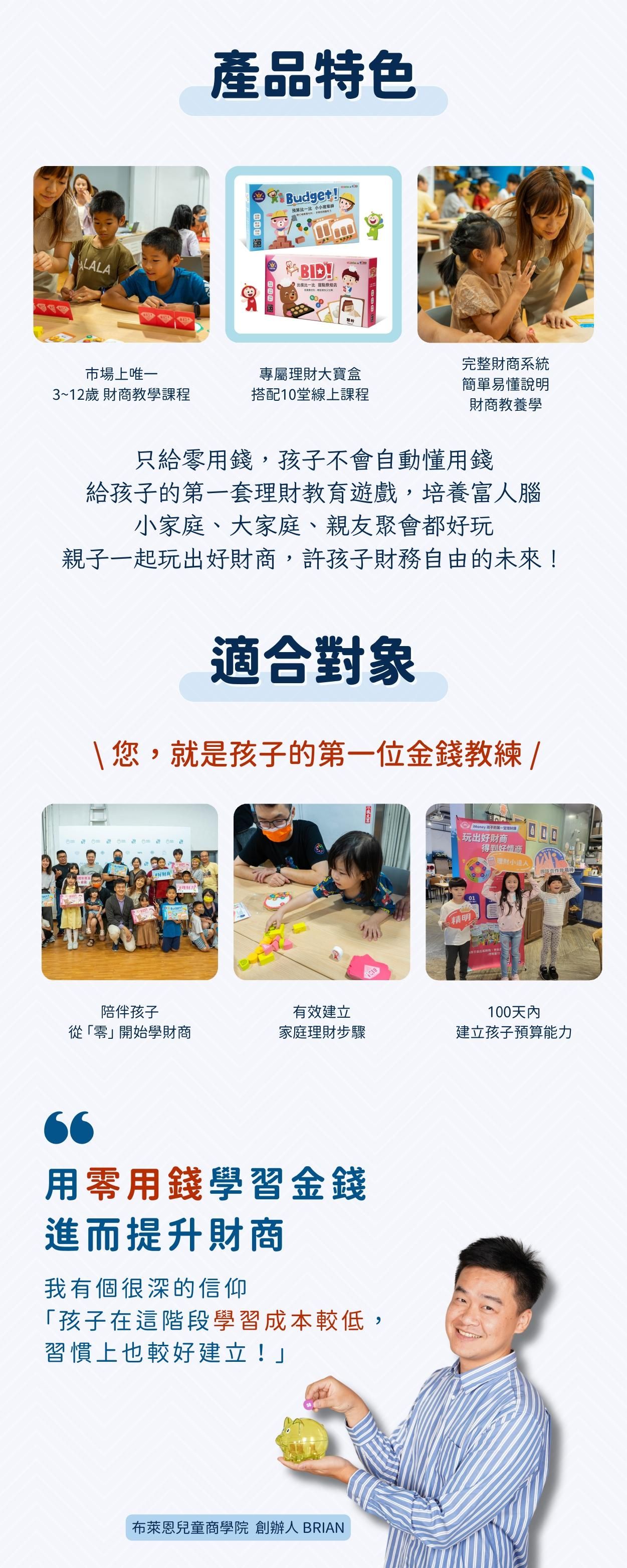 「兒童財商基礎必修課」源自「布萊恩兒童財商教學系統」,是財商知識養成中,不可或缺的啟蒙課,有效培養孩童,建立正確金錢觀及養成好習慣。