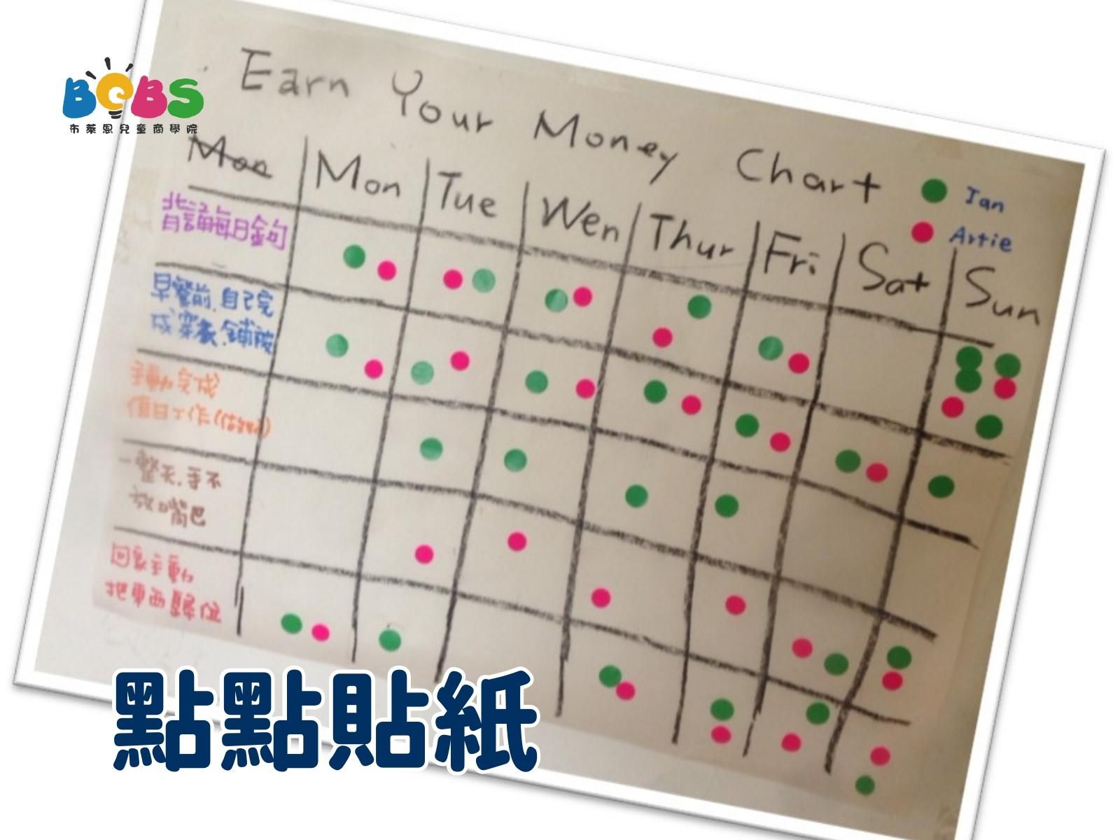 每週一次的零用錢發放,其實就是在檢視孩子當周的表現。每週,我會寫下五件我需要他們養成習慣的事,然後每天睡前,在有做到的事情貼上一張點點貼紙。